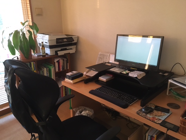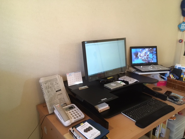 1日の間に1時間ずつ2回くらい立って作業することが多い。眠くなったときや仕事に飽きたときに立つとシャキッとする。ちなみにこのスタンディング・デスクは2年間使っているが、耐久性に問題は全くない。