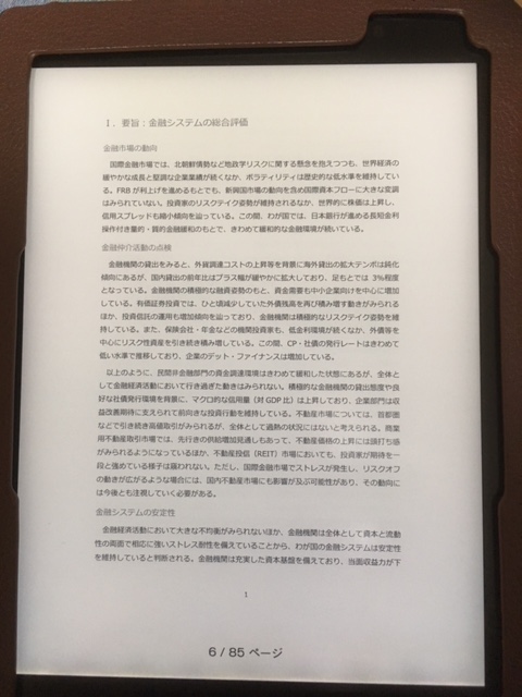 A4の原版が問題なく読める。画面を横にして、横幅一杯に拡大表示するとより読みやすいが、ページの上下の移動は、マウスのドラッグの要領で、タッチした指をゆっくり上下に動かす必要がある。この動きは少し遅いが、まあ許容範囲。