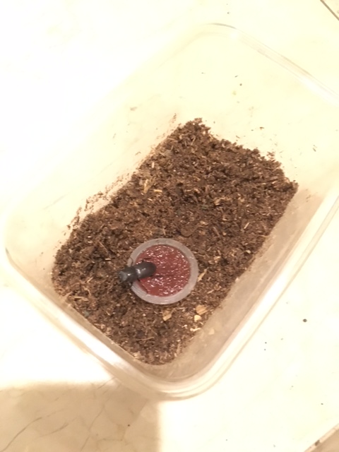 飼育ケースに入れていたエサのゼリーはカビが生えてしまうので取り除き、時々、土を湿らせていた。
